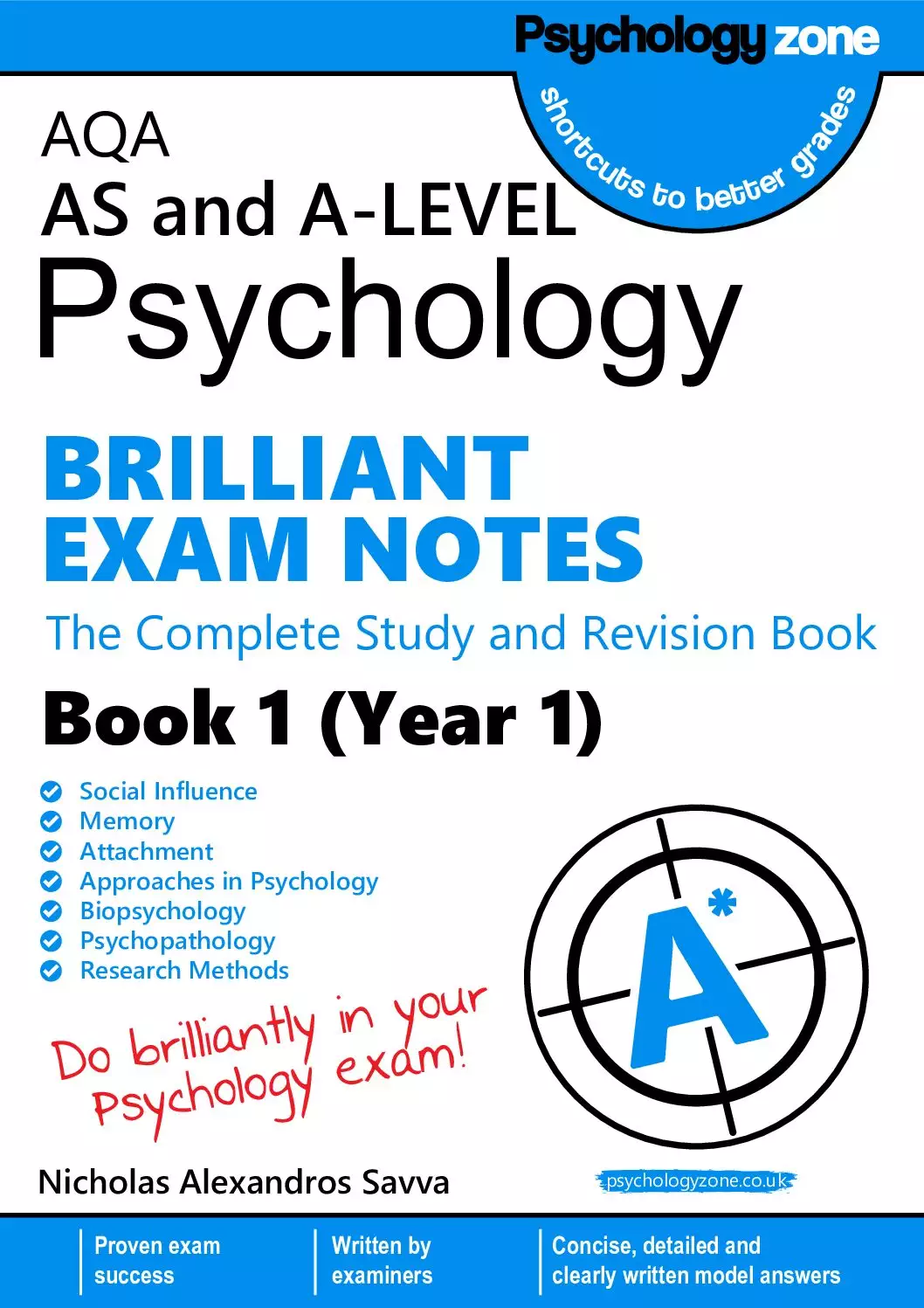 AS/A-Level AQA Psychology Exam Notes Book 1 (Year 1) have been very popular with students due to their proven formula for effective, structured study or revision notes. Each section contains all the information that you will need for the AQA psychology exam. At the end of each section, we provide a comprehensive list of exam questions. This book have been written by examiners and experienced teachers using their expertise to help students achieve the best possible grade in their exam. These exam notes have been carefully written using student friendly language and a layout that students will find easy to understand. The evaluation points for each exam notes are clearly written using a three structure (point, evidence, conclude). Each topic has been broken down into exam notes which are more concise than general psychology text books but more comprehensive than standard revision guides. This content in this book follows the latest AQA psychology specification.